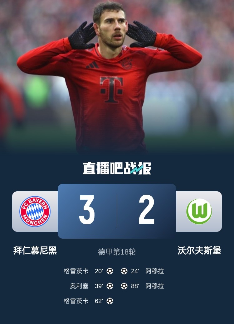 第62分钟,拜仁再入一球,奥利塞开出左路任意球,格雷茨卡头球冲顶破门梅开二度,拜仁3-1领先狼堡。↓