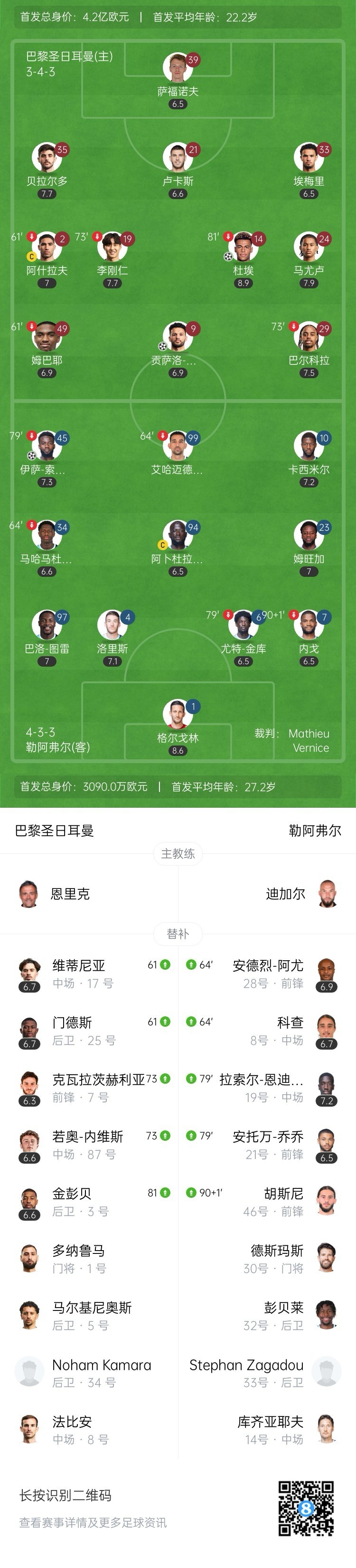 全场比赛结束,巴黎2-1击败勒阿弗尔。