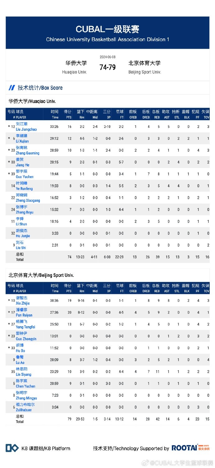 末节开局北京体大虽然外线依旧不准,但陈宇宸命中个人第三记、同时也是球队第三记三分,加上谢智杰的2+1进球,北京体大10-2开局直接拉开两位数分差占据绝对上风。大比分落后的华侨大学尝试抢三分但效果一般,抢分阶段虽然依托叶润峰的三分和李绪建的2+1追至8分但时间所剩不多。北京体大打得很乱但胜在优势大容错率高,最后华侨大学不断抢三分但时间已经不够创造神奇。最终,北京体育大学79-74力克华侨大学拿下比赛。