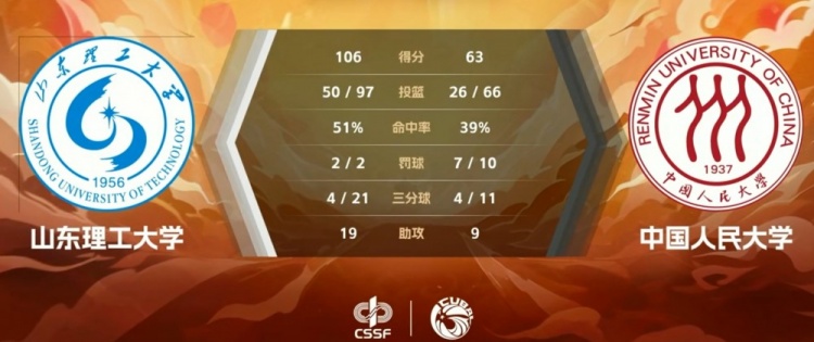 末节比赛,山东理工牢牢占据场上主动,3分钟轰出14-0的攻击波一举将分差拉开到40分以上,中国人大无力招架,山东理工稳扎稳打保持40分以上优势。邢欣抢断反击再中一球,最终,山东理工106-63以43分的巨大优势战胜中国人大。