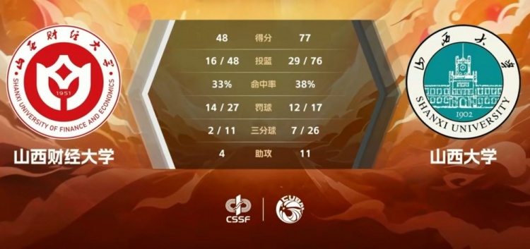 山西大学:孙威威24分,乃达木15分,张潇6分5板,李易凡5分,李嘉豪11分7板