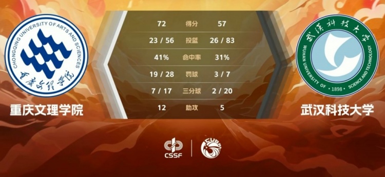 第四节,武汉科大进攻陷入停滞,连续打铁失误,重庆文理火力全开,张玉欣内外开花帮助球队不断扩大领先,周思蕴攻防两端疯狂拼抢篮板,刘艺三分穿针杀死比赛。最终,重庆文理72-57击败武汉科大。
