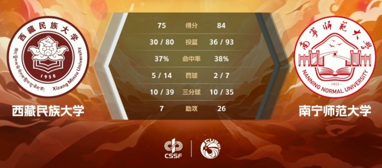 次节西藏民大进攻端状态明显回暖,扎西江村一内一外连拿5分,杨洋也在随后外线命中三分。南宁市大虽然限制不住对手但自己手握两位数优势加上进攻端依旧稳定,整个上半场南宁师大送出19次助攻,比对手多出12次,流畅的配合也成为他们一直保持领先的关键,韦骅峻最后接近压哨的进球帮助南宁师大57-44领先西藏民大进入下半场。