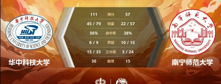 第四节,华中科大多点开花打出14-2的攻击波将分差扩大到50分以上,南宁师大无力招架,黄城向内外开花连得7分稍稍挽回颜面,华中科大利用防守反击连中两球迅速回应,最终,华中科大以111-57狂胜南宁师大54分。