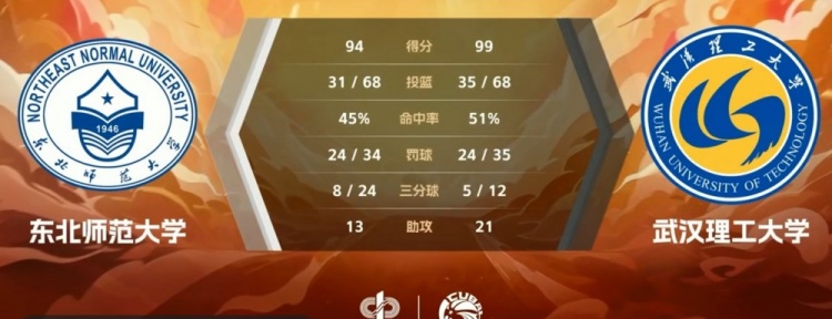 第四节,双方均选择冲击内线,东部师大稳扎稳打保持5分左右领先,付典钦飙中三分,武汉大学持续发力打出9-2的攻击波缩小分差,关键时刻付典钦两罚全中扳平比分,徐鸣阳三罚全中后付典钦打成2+1再度追平,东北师大连续打铁失误,王鹏翼4罚3中杀死比赛。最终,武汉理工大学99-94力克东北师范大学。