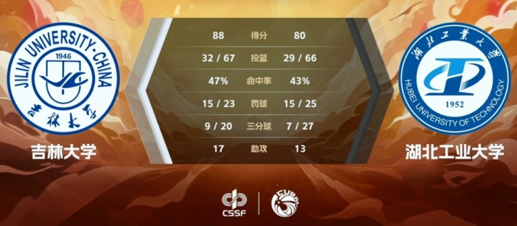 吉林大学:段世镭22分10篮板3助攻3抢断、刘滨畅22分8篮板、陆占吉17分9篮板2封盖、罗奕桐11分5篮板、王鹏4分2篮板5助攻、林晓峰5分9助攻、方伯杨7分。
