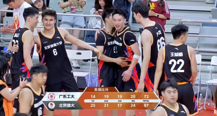 末节广东工大再度哑火,反倒是北体大在杨腾飞的连续拿分中送上11-2的攻势拉开20分的领先。这之后北体大彻底掌控局面,杨腾飞弧顶稳稳命中打板三分,祖力布哈尔和陈伟东相继得分守住大比分优势锁定胜局。最终,北京体育大学87-72轻取广东工业大学顺利杀入全国大赛八强。