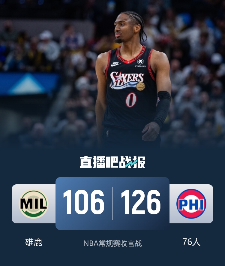 开场后雄鹿展现出不错精气神,乔治连续拿分帮助76人取得领先,他下场休息后雄鹿连得8分一度反超比分,德拉蒙德替补登场后相当活跃帮助76人稳住局面。第二节上来76人延续攻势将分差拉大,雄鹿依旧内外开花紧咬比分,第二节后半段AJ·格林和瑞安联手爆发帮助雄鹿在半场结束时反超4分。易边再战,马克西突然找回状态,他利用犀利的突破帮助76人打出攻势夺回领先,雄鹿也是命中率下降,第三节76人单节净胜22分。最后一节雄鹿进攻依旧没有起色,76人将分差拉大到20分以上,比赛失去悬念,最终76人126-106轻松拿下雄鹿以2连胜收官常规赛。