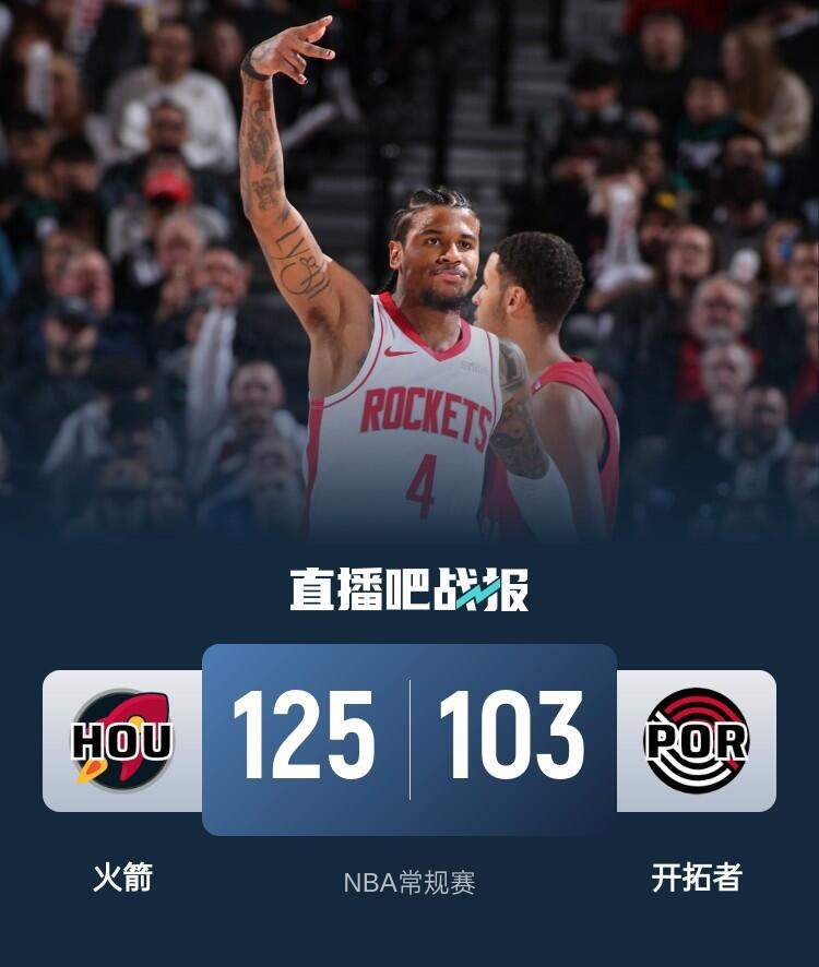 开场后申京和狄龙联手帮助火箭以10-2开局,随后卡马拉冲击力十足不断拿分帮助开拓者追上比分,杰伦-格林压哨三分帮助火箭以2分优势结束首节。第二节,火箭外线手感依旧不理想,西蒙斯两记三分帮助开拓者反超比分,伊森多次进攻内线得手帮火箭夺回领先。易边再战,申京上来连进两球,随后狄龙和杰伦-格林外线开花连中三分,火箭一波攻势迅速将分差拉大到两位数。最后一节火箭延续不错的进攻状态,杰伦-格林没有再登场,火箭继续将分差拉大,开拓者无力回天,最终火箭125-103送给开拓者5连败。