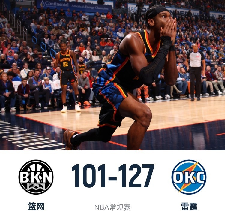 一开场,雷霆攻防两端占据绝对优势,以赛亚-乔独中4记三分,雷霆单节轰下9记三分以39-19领先20分结束首节,第二节,篮网进攻回暖,双方围绕20分的分差展开拉锯战,篮网不断冲击篮筐,雷霆多点开花给出回应,半场战罢雷霆69-49领先篮网。下半场,篮网持续反击缩小分差,亚历山大得分助攻一肩挑稳住局势,末节雷霆一波10-4继续扩大领先,双方换下主力阵容耗完垃圾时间。最终,雷霆127-101轻取篮网,主场过关。