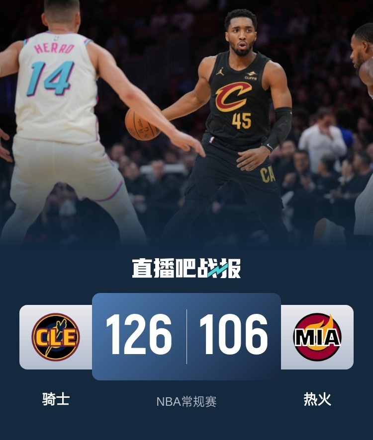 一开场,双方短暂相持,骑士多点开花,热火里突外投给出回应,米切尔高效输出带队取得两位数优势,次节双方围绕10分左右分差展开拉锯战,热火后程乏力,骑士稳扎稳打不断扩大领先,半场战罢骑士59-41领先热火。下半场,海史密斯连得10分,骑士多点开花保持优势,希罗突然发力40秒连得8分,末节双方继续围绕两位数分差展开拉锯战,骑士稳扎稳打将优势保持到最后,最终,骑士126-106击败热火,客场过关。