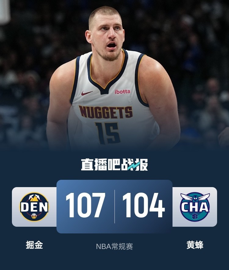 比赛开始,约基奇进攻端继续轻松写意,有内有外的同时再带动队友,很快带队建立主动权,而黄蜂则是全民皆兵追分,首节掘金领先7分,次节双方展开拉锯战,布劳恩接连反击打成单节上双,但尼克-史密斯外线连续回应,半场掘金还领先8分。下半场,约基奇继续有攻有传,不到半节便砍下三双,掘金顺势拉开双位数领先,但马威内线止血,尼克-史密斯外线依然保持不错手感回应,三节掘金还领先9分,末节掘金突然断电,打了9分钟仅得6分,黄蜂直接追平比分,随后约基奇接连内线强打止血,但小桥突投连砍4分带队反超,约基奇2+1续命后两罚全中反超1分,穆雷反击再进,最终掘金107-104拒绝黄蜂逆转。