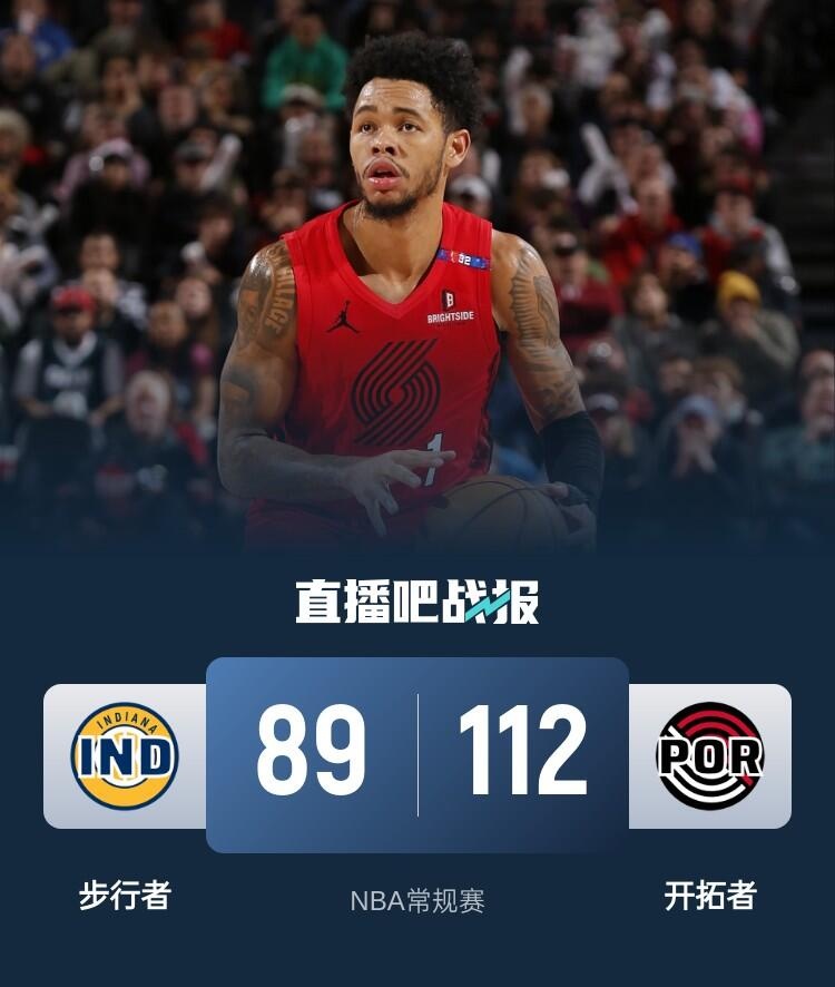 开场后开拓者率先进入状态以7-0开局,马瑟林和西亚卡姆一度帮助步行者迫近比分,亨德森替补登场后带领轮换阵容掀起攻势再度将分差拉开。第二节上来两队节奏依旧打得飞快,但是命中率都不是太高,开拓者依旧占据场上主动。易边再战,步行者多次掀起反扑,分差最小时只有1分,但开拓者总能及时利用三分回应,并且在第三节尾声通过冲击内线将分差拉大到两位数。最后一节虽然步行者率先发力又缩小分差,但随后他们进攻断电,开拓者外线火力全开,亨德森、西蒙斯和格兰特三人轮番开火将分差拉大到20分,比赛失去悬念,最终开拓者112-89轻松击败步行者取得5连胜,步行者4连胜被终结。