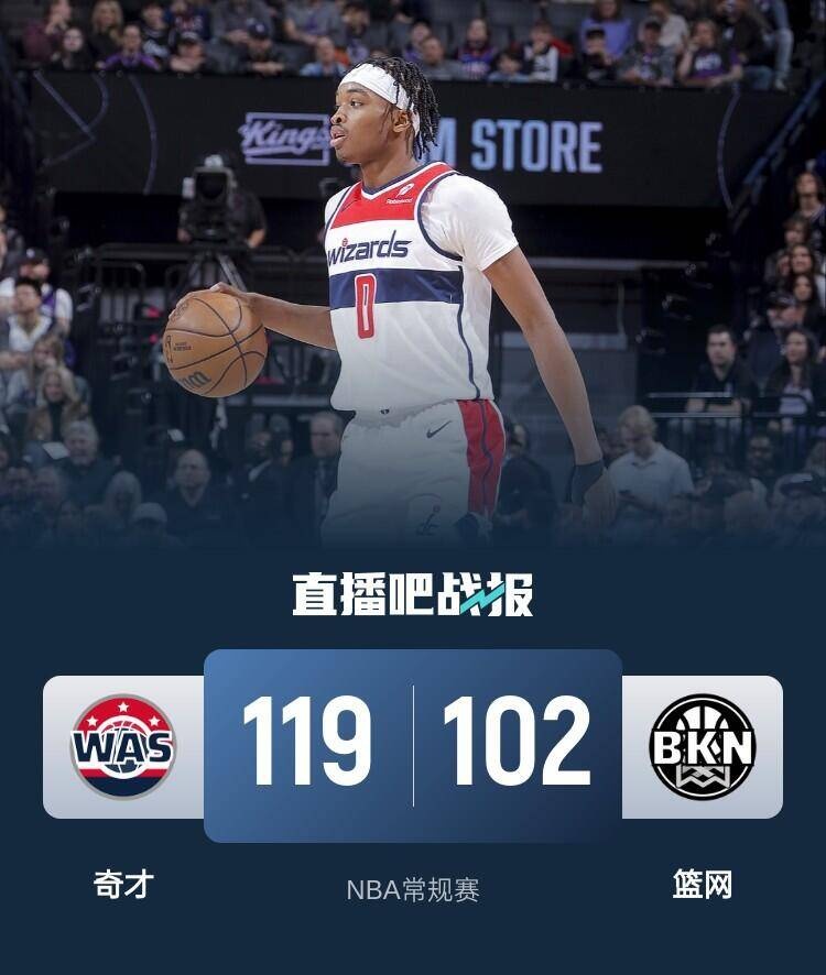比赛开始,奇才反客为主上来打出10-2不错开局,基翁-约翰逊连砍5分止血,随后奇才接连外线发炮一度拉开双位数领先,篮网全民皆兵追到差7分,次节双方展开对攻战,卡梅隆-约翰逊找到手感,里突外投带队一度追平比分,但奇才外线神准能回应半场领先4分。下半场,双方命中率骤降,打了近8分钟篮网还没有得分上双,奇才抓住机会重新拉开双位数领先,末节奇才上来8-0拉开20分以上领先,基翁-约翰逊里突外投追分但奇才总能回应守住领先优势,最终奇才119-102轻取篮网,拿到3连胜同时终止对手3连胜。