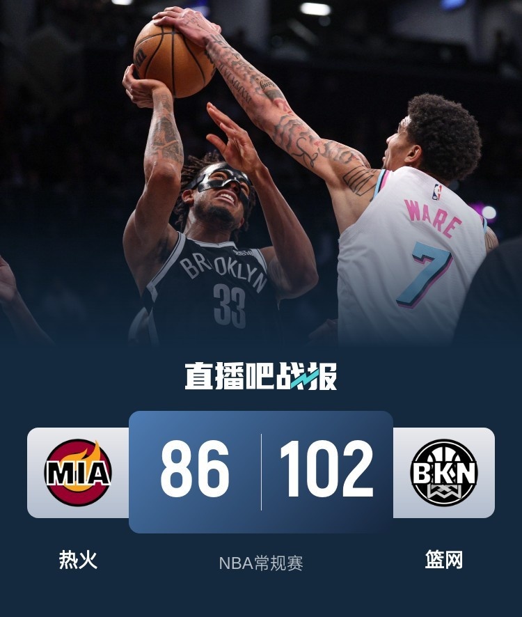 开场后阿德巴约带领热火率先打出攻势,随后篮网外线多点开花掀起反扑将比分反超,罗齐尔替补登场后状态火热接连拿分,热火在第一节后半段到第二节开局打出一波高潮夺回领先。篮网多点开花紧追不舍,并且在半场结束前连得7分将比分追平。易边再战,克拉克斯顿在内线表现活跃,阿德巴约强势回应联手希罗帮助热火再度建立领先。最后一节热火进攻断电,篮网一举反超比分并将分差拉大到两位数,最终篮网102-86扑灭热火。