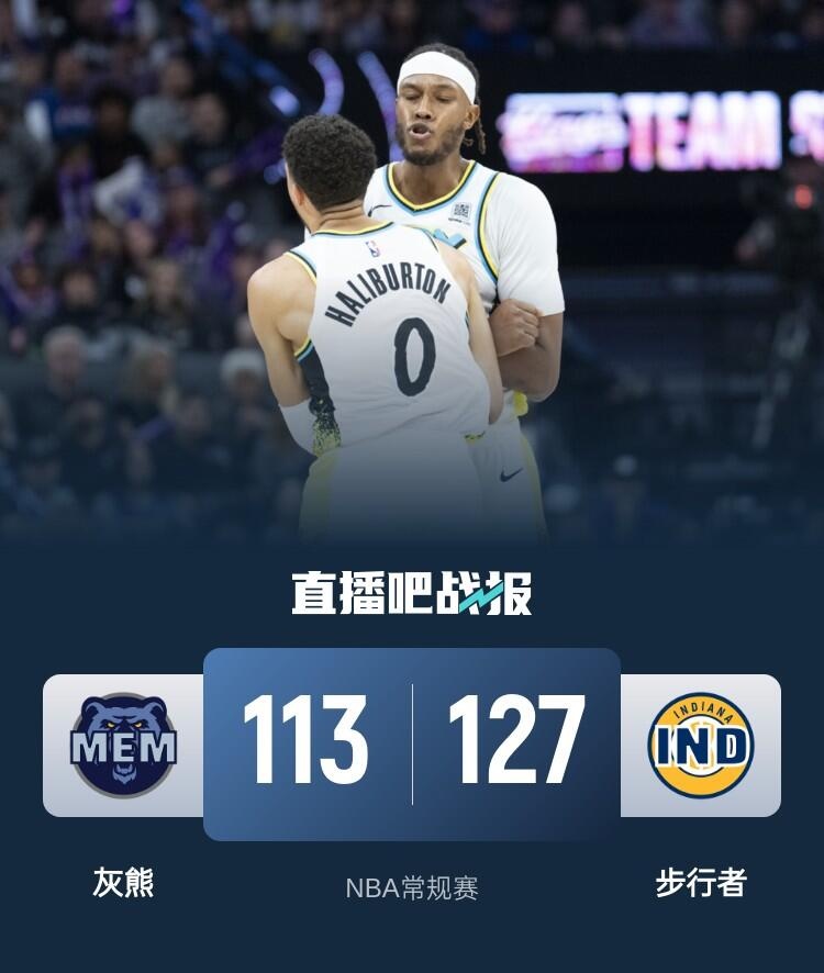 上半场,灰熊率先发力,多点开花很快占据场上主动,步行者连中三分追赶,次节步行者万箭齐发,特纳内外开花独得15分,哈利伯顿得分助攻一肩挑,步行者单节50-26净胜灰熊24分,半场战罢步行者78-59领先灰熊。下半场,步行者占得先机将分差拉开到26分,但灰熊攻防两端发力一度追到只差4分,末节步行者稳扎稳打再度将分差拉开到15分以上,灰熊大势已去无力回天。最终,灰熊113-127不敌步行者,客场落败。
