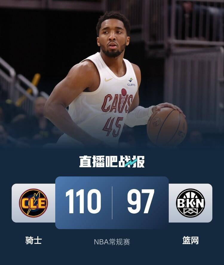 开场后骑士后场双枪轮番砍分,篮网则依靠冲击内线紧追不舍,第二节上来篮网一阵三分雨将比分反超,骑士及时回应攻势稳住阵脚,不过半场结束前篮网一波12-2的高潮再度将比分反超,以2分优势领先结束上半场。下半场回来篮网在进攻端延续状态保持领先,拉塞尔崴脚离场,随后骑士防守强度提升,一波13-0的攻势夺回领先,第四节上来亨特又是连续两记三分帮骑士将分差拉大到两位数,篮网虽然一度咬住比分,但随后他们进攻断电,骑士又一波11-0锁定胜局。最终骑士110-97战胜篮网取得5连胜,篮网3连胜被终结。