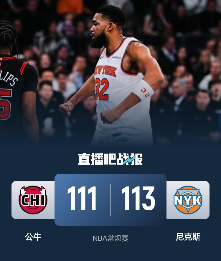 首节开打后武切维奇连续取分率队占优,唐斯联手布伦森及时回应,中段两队外线火热对飚,首节结束时公牛领先2分,次节回来,公牛进攻出现停滞,布伦森火力不减率队后来居上,半场战罢,尼克斯反超确立7分优势。易边再战后公牛找回进攻感觉,双方你来我往火热对攻,唐斯突然爆发单节狂揽20分,三节结束后尼克斯依然领先2分,末节决战,基迪手感滚烫连中三分,决胜时刻武切维奇三分再中,但鲍尔空位三分不中,武切维奇绝杀遭布里奇斯大帽,双方战至加时,唐斯连续取分接管比赛,武切维奇绝平未果,最终尼克斯113-111力克对手。