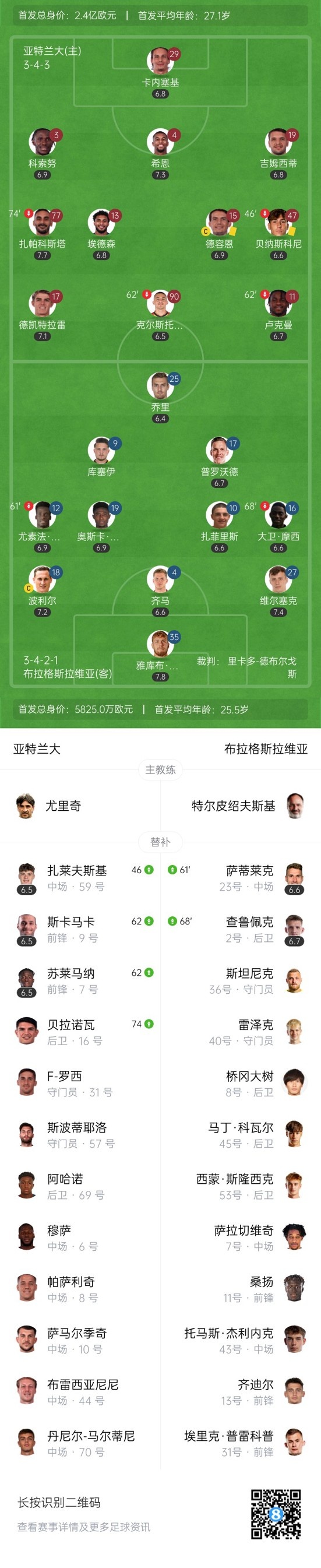 上半场补时5分钟,亚特兰大0-0布拉格斯拉维亚。