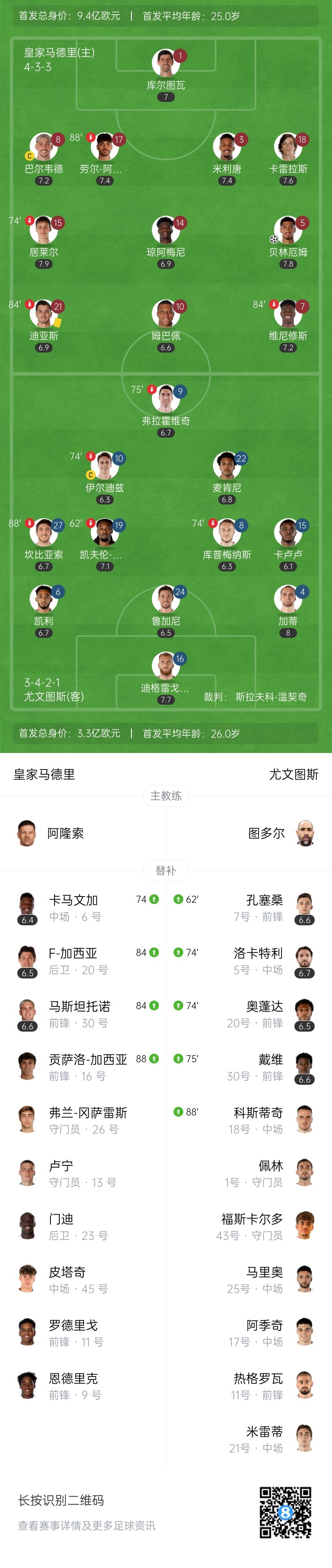 10月23日讯 欧冠联赛阶段第三轮,皇马坐镇主场伯纳乌迎战尤文。上半场,阿森西奥关键解围,姆巴佩失良机。易边再战,弗拉霍维奇失单刀,维尼修斯个人秀中柱,贝林厄姆补射破门。最终皇马1-0尤文。积分榜方面,皇马3轮9分暂第五,尤文仅2分暂第25。