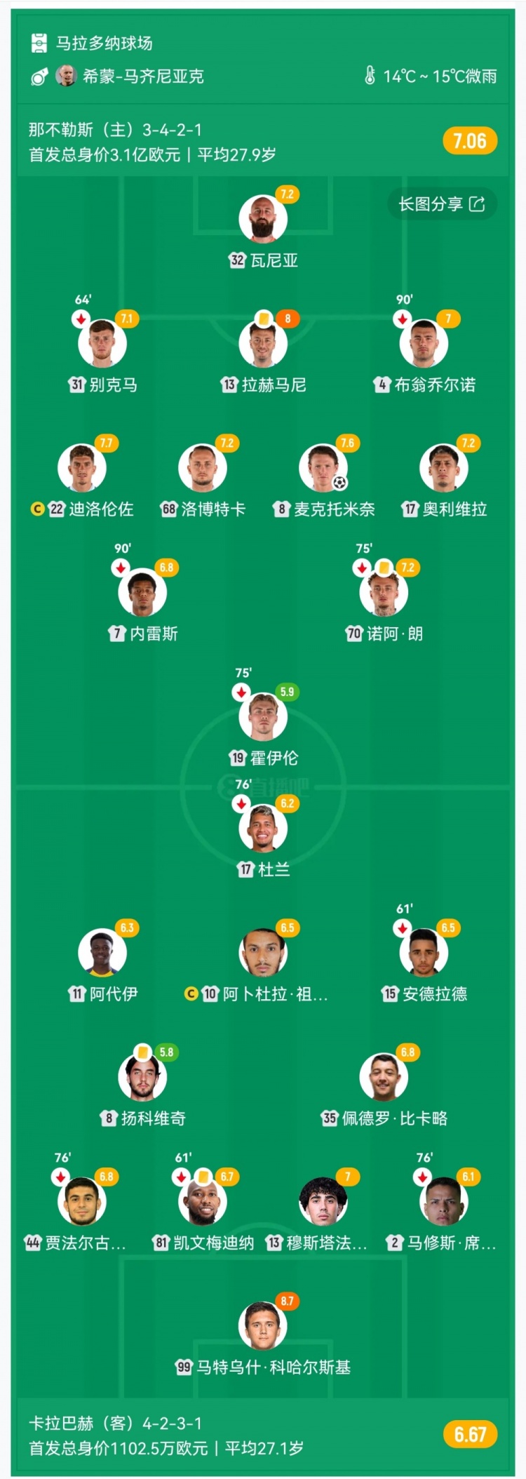 第72分钟,还是那不勒斯的反击机会,内雷斯右侧传中到后点,队友跟进再传中,麦克托米奈侧勾打门击中扬科维奇入网,那不勒斯2-0领先↓