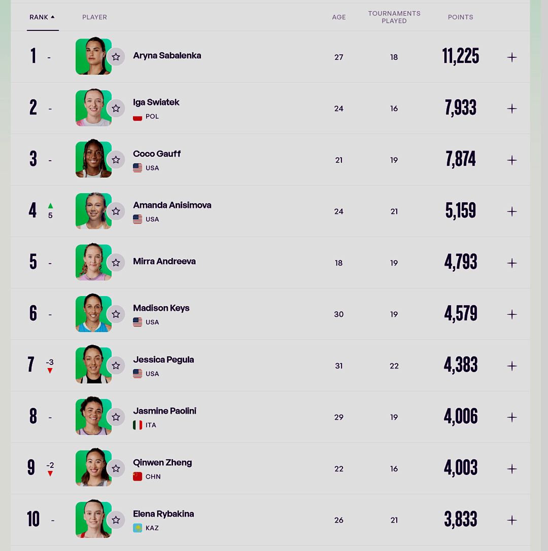 女单方面:TOP10中的最大变化是美网亚军阿尼西莫娃首进TOP5,排在第四位。中国一姐郑钦文下滑至第九位,二姐王欣瑜位列第35位,其他金花都在100名开外。