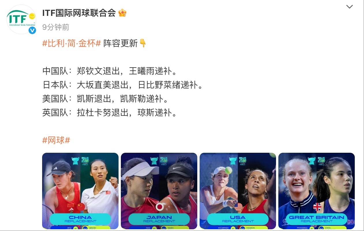 9月9日,比利简金杯官宣郑钦文退出,王曦雨替补代表中国队出战。此外,大坂直美、凯斯和拉杜卡努三位大满贯冠军也退赛。中国:郑钦文退出,王曦雨加入美国:凯斯退出,凯斯勒加入日本:大坂直美退出,日比野菜绪...发表于:09月09日