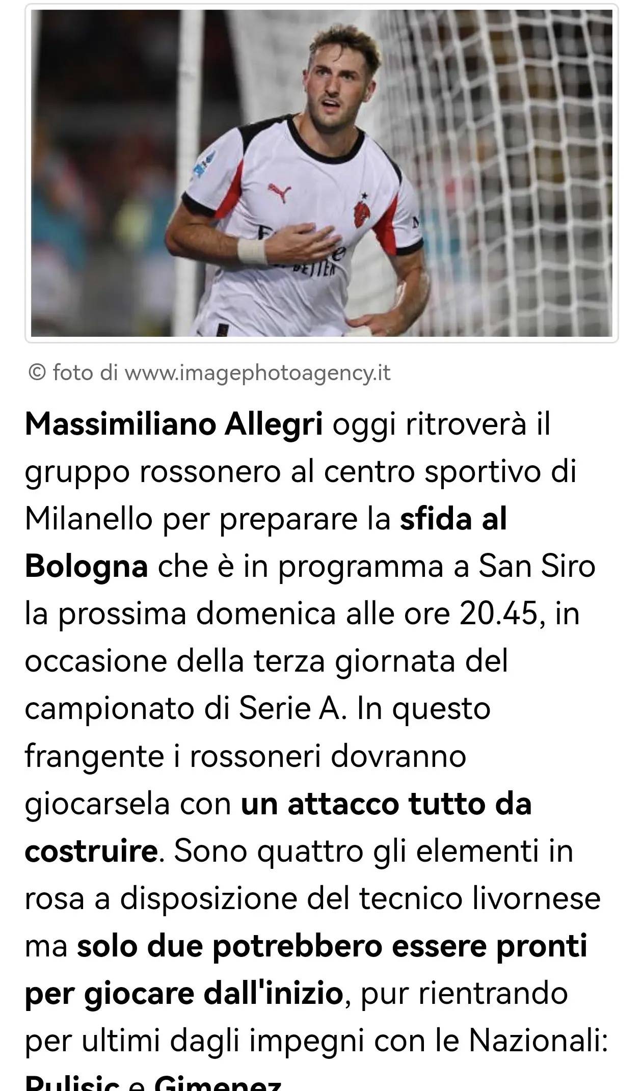 意甲媒体透露:米兰下轮对阵博洛尼亚,阿莱格里的首发锋线将是大西门和普利西奇