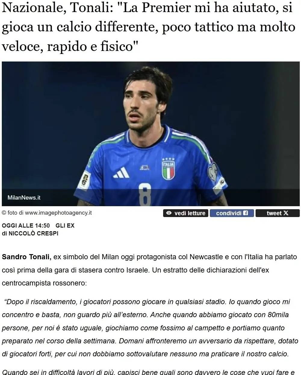 昨天的比赛再一次证明意大利中场除了托纳利,剩下的都是一群普通球员。就今天的情况看也许正如托纳利所说加盟英超对自身成长十分重要。这个事情可以理解,就好像几十年前最好的球员都要加盟意甲一样,那时候哪怕是意大利一些保级俱乐部队内的名字都令人惊讶,各领风骚数百年,现在轮到英超了,希望托宝在英超可以越来越好!