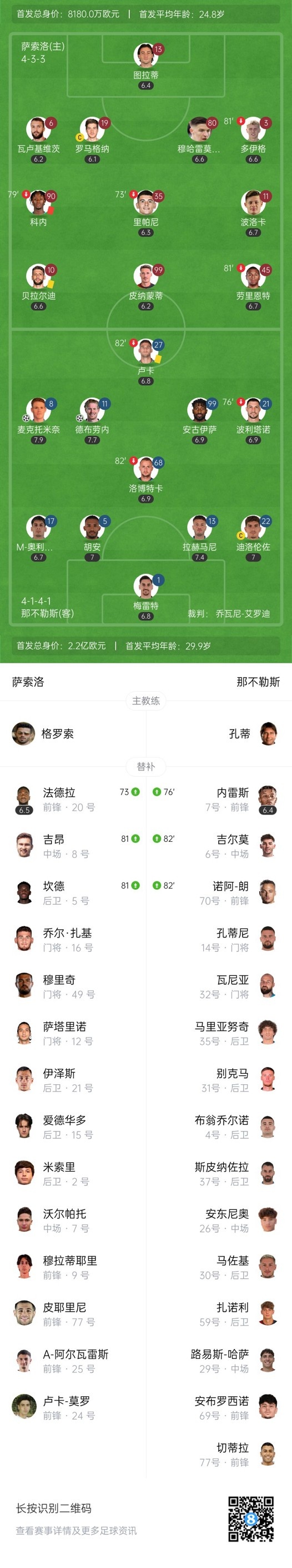下半场补时5分钟,萨索洛0-2那不勒斯。