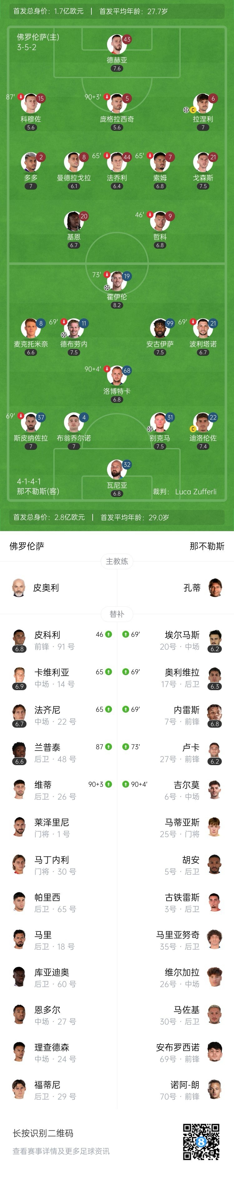 第79分钟,佛罗伦萨开出左路角球至禁区内,第一点那不勒斯球员头球顶了一下,卢卡-拉涅利后点得球后低射破门,佛罗伦萨扳回一城,3-1!↓