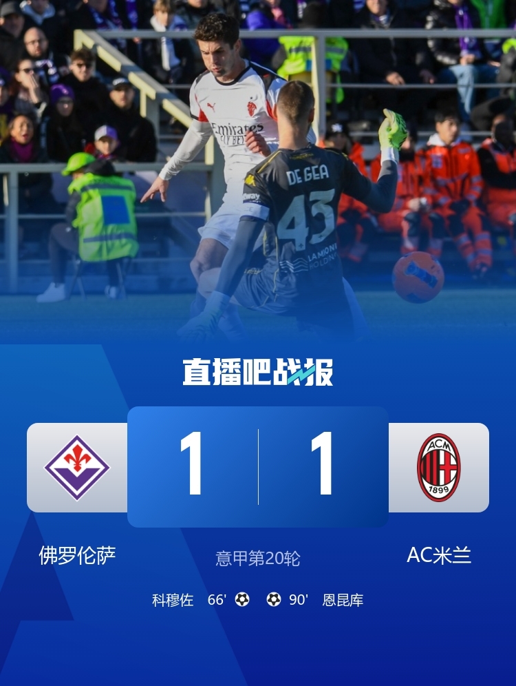 1月12日讯 北京时间22:00,意甲第20轮佛罗伦萨vsAC米兰。上半场,普利西奇两失单刀,德赫亚屡献神扑!佛罗伦萨主帅瓦诺利染红。下半场,科穆佐破门帮助佛罗伦萨取得领先!恩昆库90分钟绝平!最终,AC米兰1-1战平佛罗伦萨,意甲两连平!先赛落后榜首的国米2分。