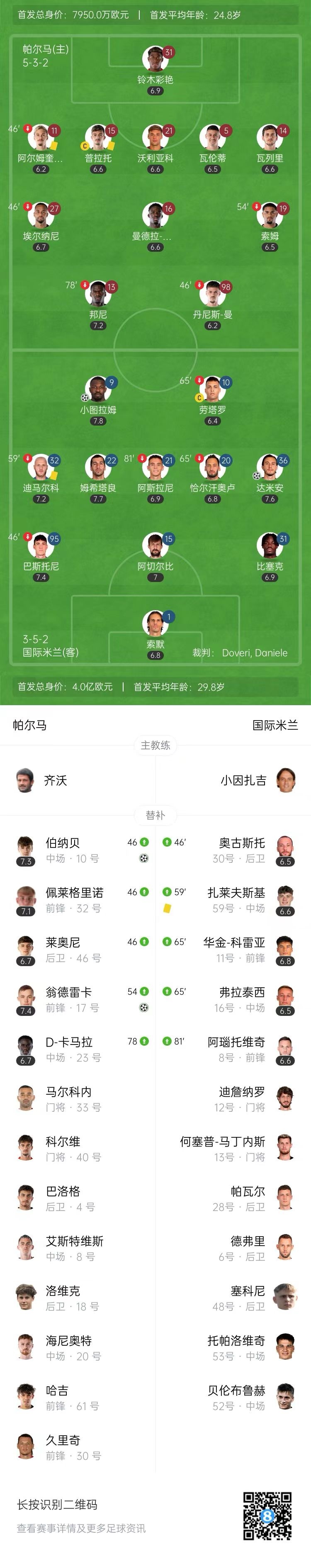 第69分钟,帕尔马反击,翁德雷卡左侧带球突入禁区打门,皮球弹在阿切尔比腿上发生折射,索默反应不及,帕尔马扳平比分,2-2!↓