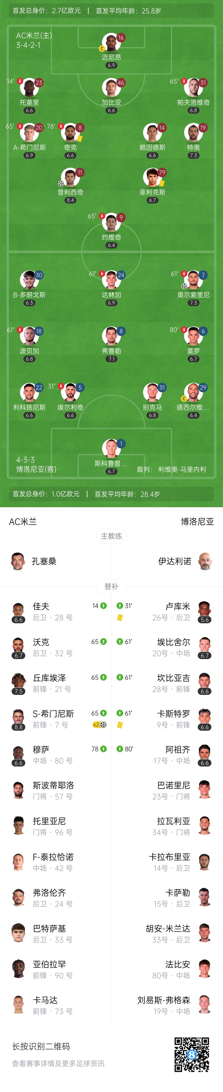 第79分钟,丘库埃泽左路下底回做,菲利克斯禁区内打门被封堵,普利西奇跟进直接补射入网,米兰2-1反超比分↓