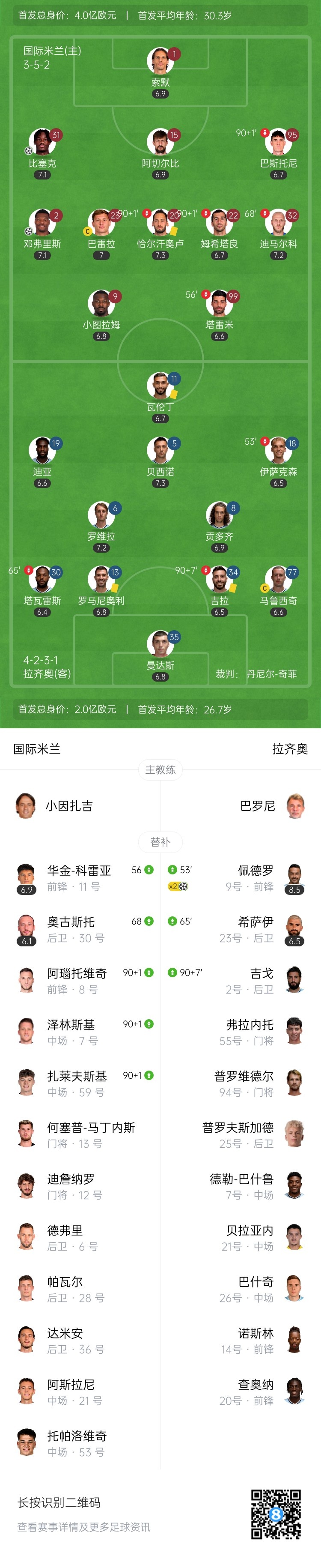 第79分钟,国米前场任意球机会,球罚向后点,邓弗里斯高高跃起头球攻门得手,国际米兰2-1拉齐奥。↓