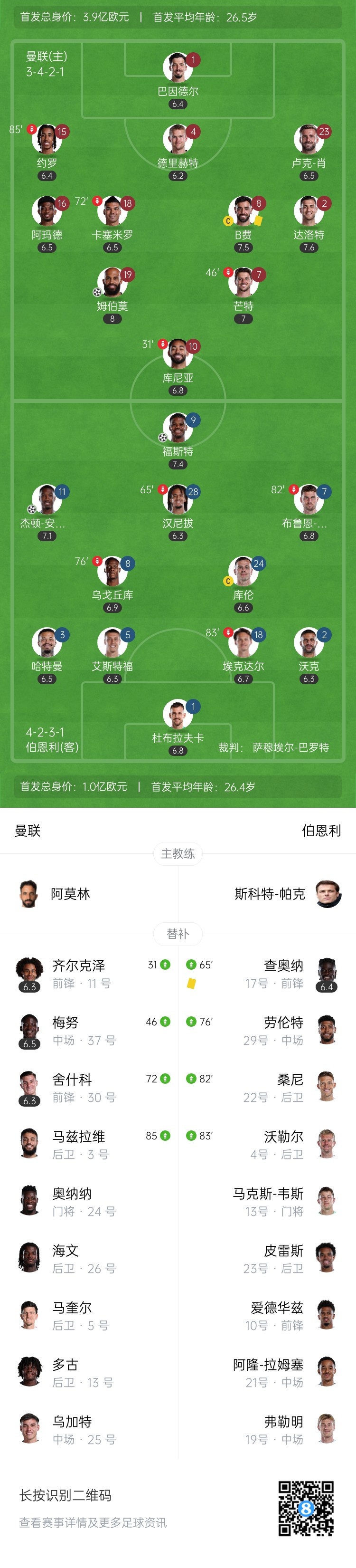 8月31日讯 北京时间8月30日22:00,2025-26赛季英超联赛第3轮,曼联坐镇老特拉福德球场迎战伯恩利。上半场芒特禁区内倒地,主裁判先判罚点球,随后观看大屏幕后取消,卡塞米罗头球攻门造成库伦乌龙球,库尼亚伤退,芒特中横梁,曼联暂1-0伯恩利;下半场福斯特为伯恩利扳平比分,姆伯莫迅速破门再度帮助红魔反超,随后福斯特进球因越位无效,不过杰顿-安东尼破门再度帮助伯恩利扳平,补时阶段阿玛德造点,B费点射绝杀,最终曼联3-2伯恩利,惊险取得赛季首胜。
