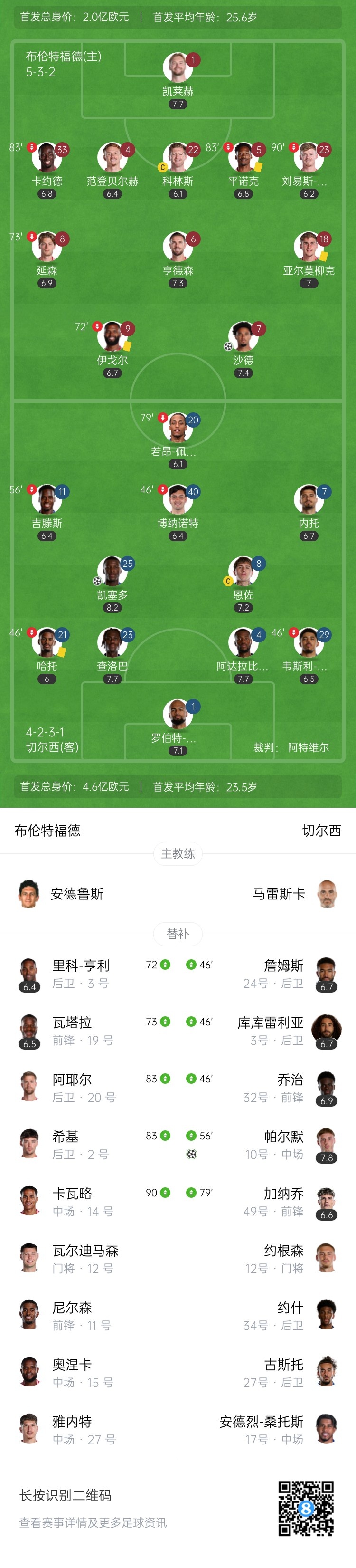 下半场补时6分钟。最终全场比赛结束,布伦特福德2-2切尔西。