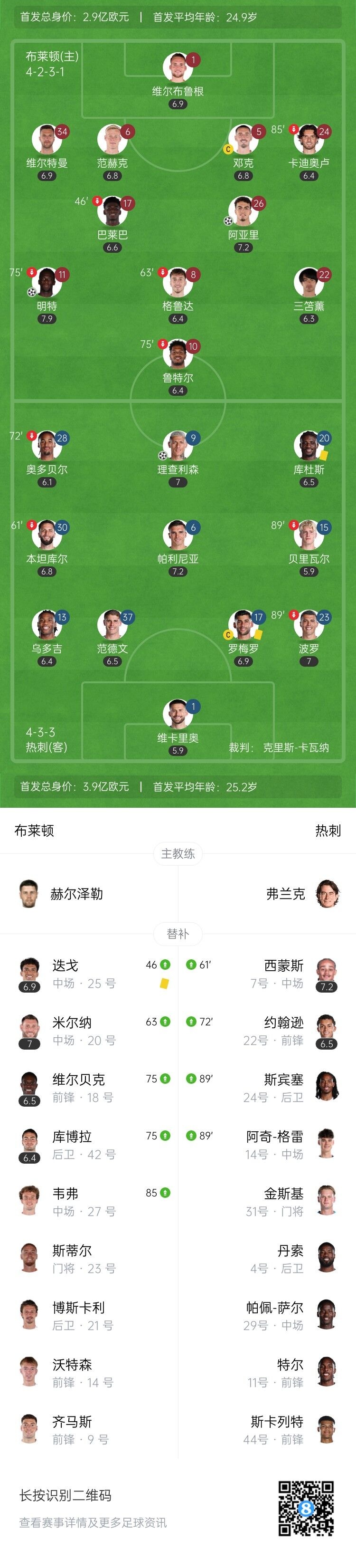伤停补时5分钟。全场比赛结束,布莱顿2-2热刺。