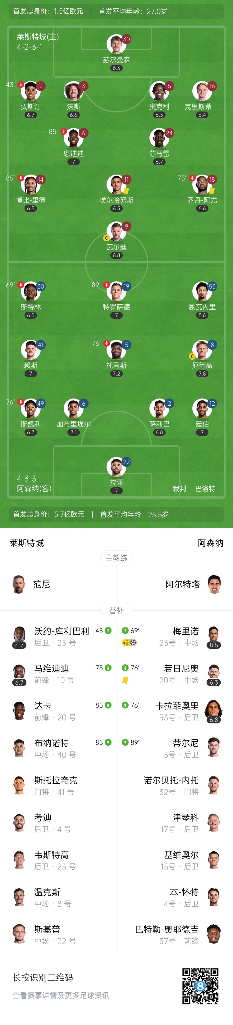 2月15日讯 北京时间2月15日20:30,2024-25赛季英超联赛第25轮,阿森纳在皇权球场客战莱斯特城。上半场两队都没有创造出太多机会,各有1次射正,贾斯汀伤退,两队暂0-0战平;下半场梅里诺双响,恩瓦内里助攻,最终阿森纳2-0莱斯特城,先赛一场距榜首4分。