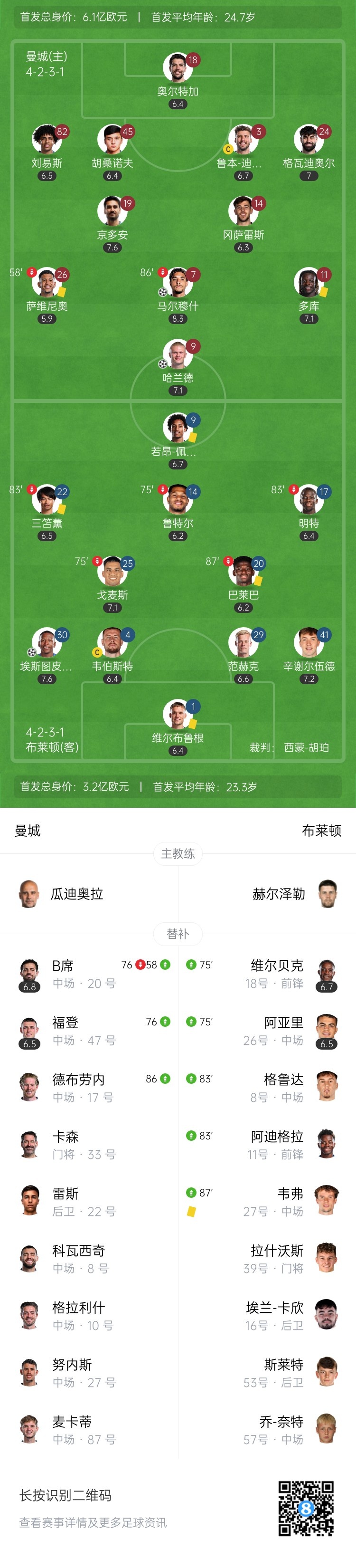 全场比赛结束,最终曼城2-2布莱顿。