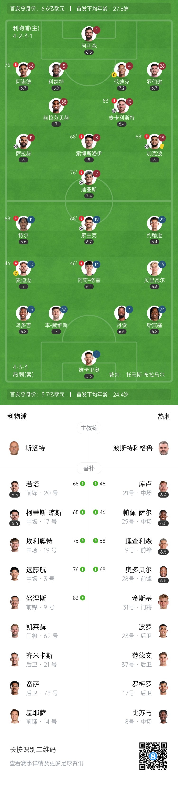下半场伤停补时4分钟,全场比赛结束,最终利物浦5-1热刺。