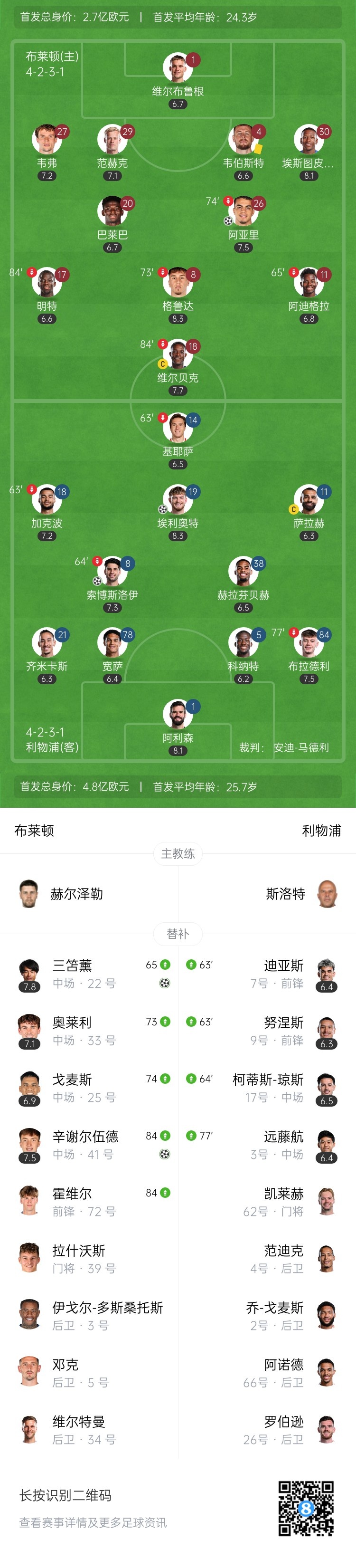 第32分钟,布莱顿打出精彩配合!维尔贝克中锋位置做球,格鲁达不停球凌空一端,插上的阿亚里杀入禁区,推射球门左下角破门!布莱顿1-1扳平利物浦↓