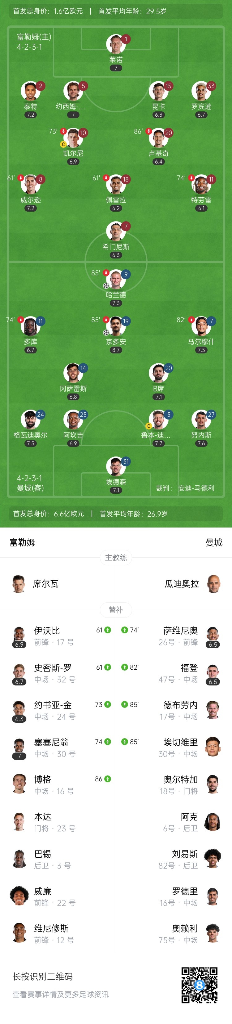 第21分钟,前场努内斯头球摆渡,马尔穆什再回做,努内斯突入禁区尝试挑射,但被莱诺扑出,随后京多安小禁区内倒钩射门,这球击中横梁弹入球门,曼城1-0富勒姆。↓