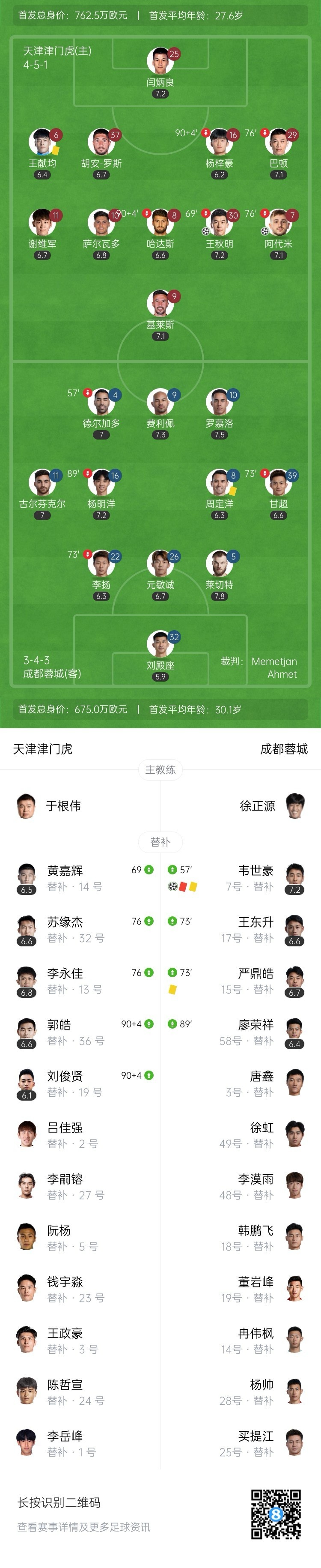 全场比赛结束,津门虎2-1击败蓉城。