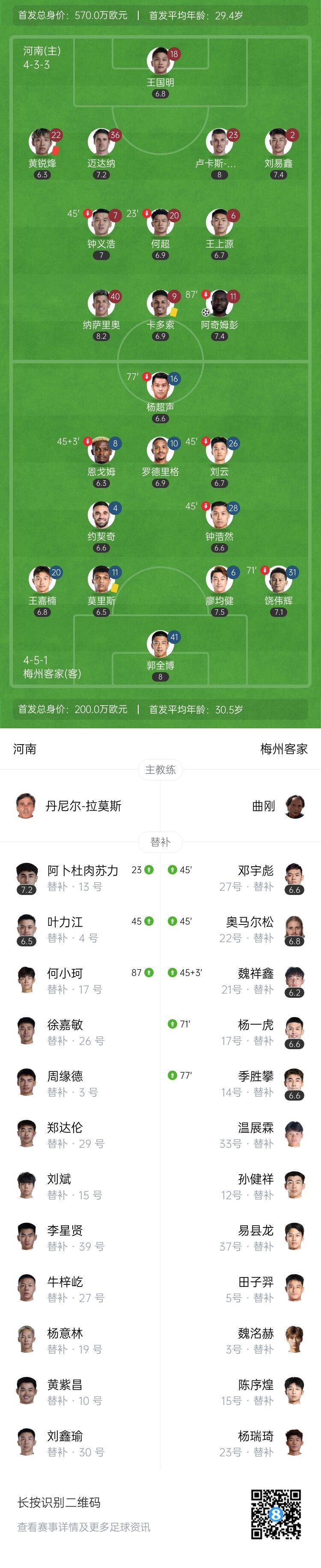 7月19日讯 北京时间7月19日晚上20:00,中超第17轮,河南坐镇郑州航海体育场迎战梅州客家。上半场,黄锐烽直红,恩戈姆伤退。下半场,阿奇姆彭头球破门,莫里斯94分钟绝平。全场比赛结束,河南1-1梅州客家。本场过后,河南4轮不胜,积16分排名第13;梅州9轮不胜,积13分排名第14!