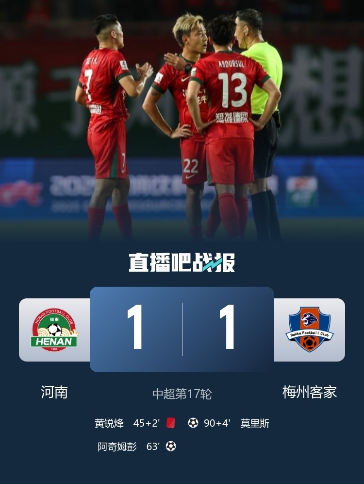 皆多轮不胜!10人河南1-1梅州 黄锐锋红牌阿奇姆彭破门莫里斯绝平