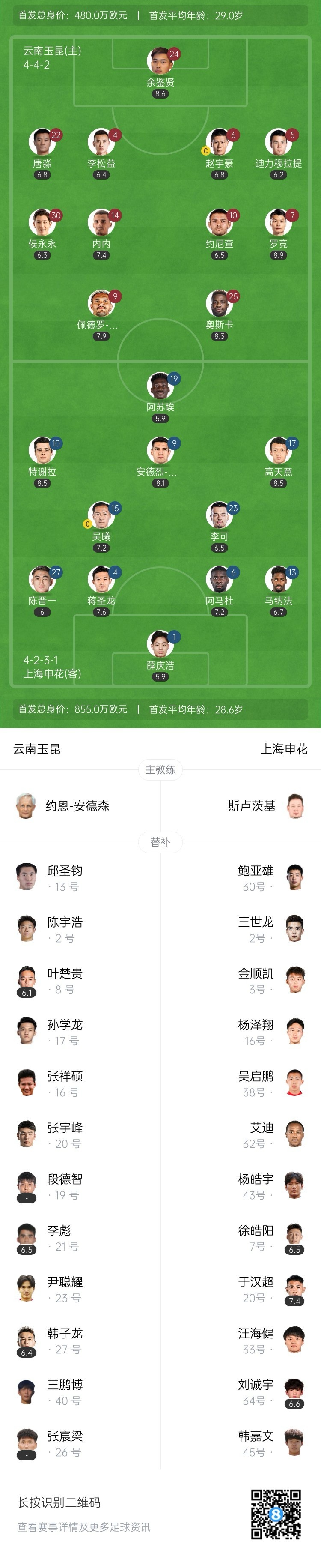 全场比赛结束,上海申花客场4-4战平云南玉昆。