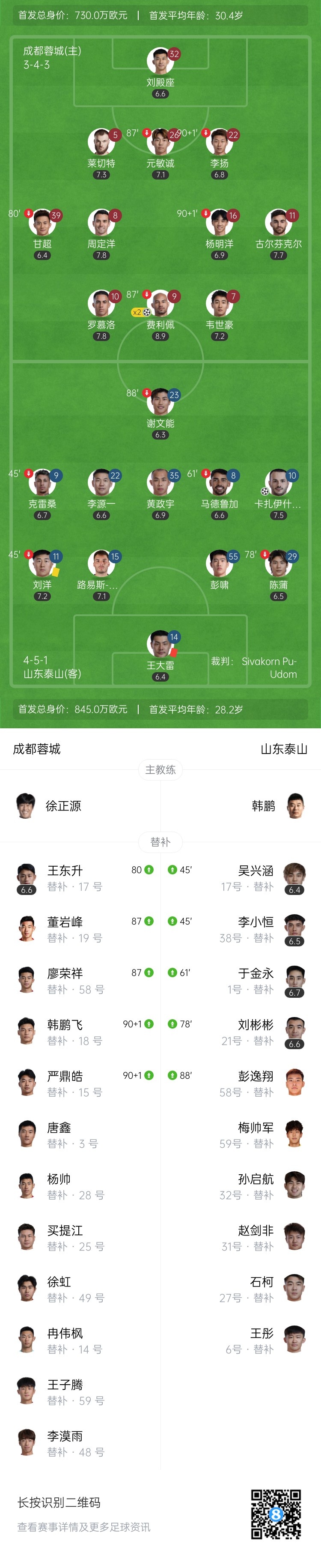 三杀!蓉城2-1十人泰山 王大雷直红费利佩双响 卡扎破门难救主
