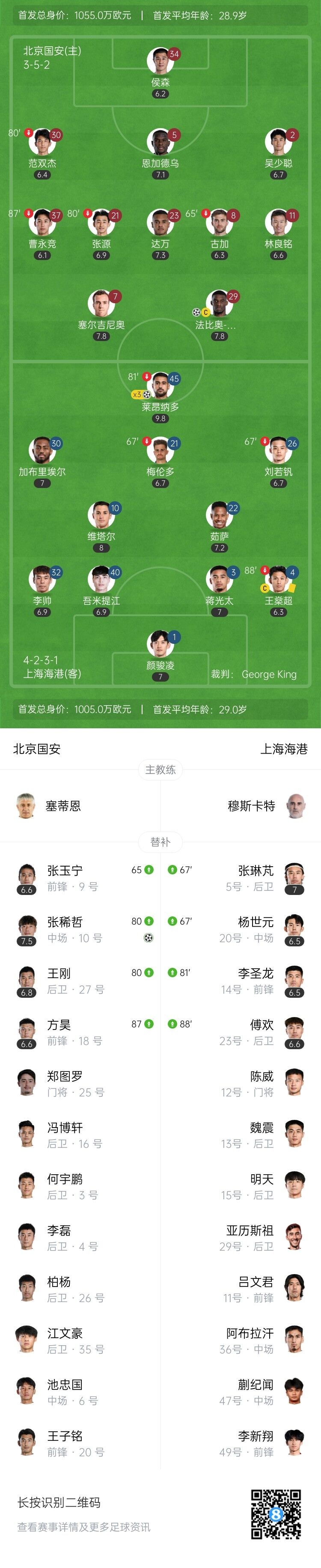 伤停补时9分钟。全场比赛结束,北京国安2-3上海海港。