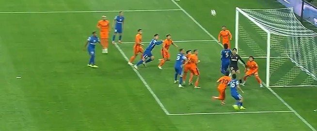 第17分钟,申花左路角球开到禁区后点朱辰杰高高跃起头球顶高了。↓